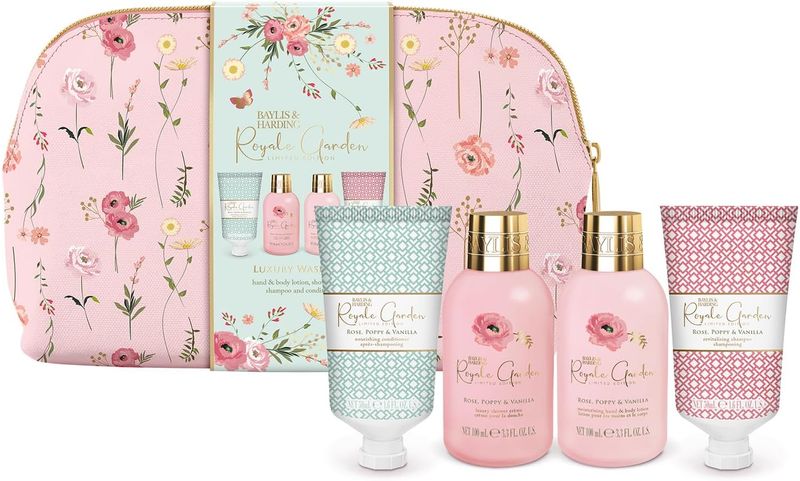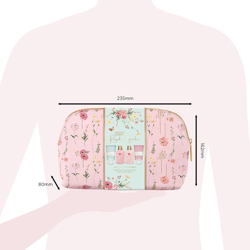 El Luxury Wash Bag Gift Set incluye 100 ml de Shower Crème, 100 ml de Hand & Body Lotion, 50 ml de Shampoo y 50 ml de Conditioner, todo con la fragancia Royale Garden Rose, Poppy & Vanilla de Baylis & Harding. Este set no ha sido probado en animales, no contiene ingredientes de origen animal y es ap