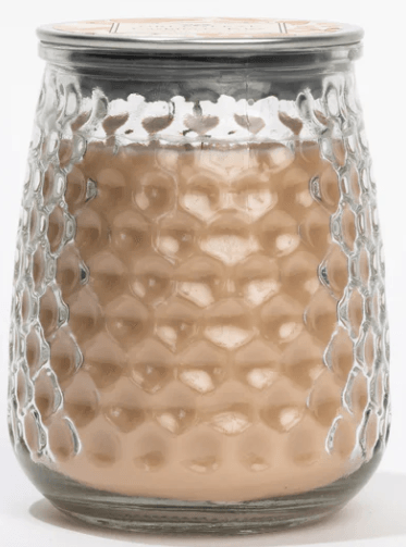 Vela aromática en frasco de vidrio texturizado. Aroma cálido y envolvente con notas de vainilla, ámbar y sándalo. Duración: hasta 100 horas.