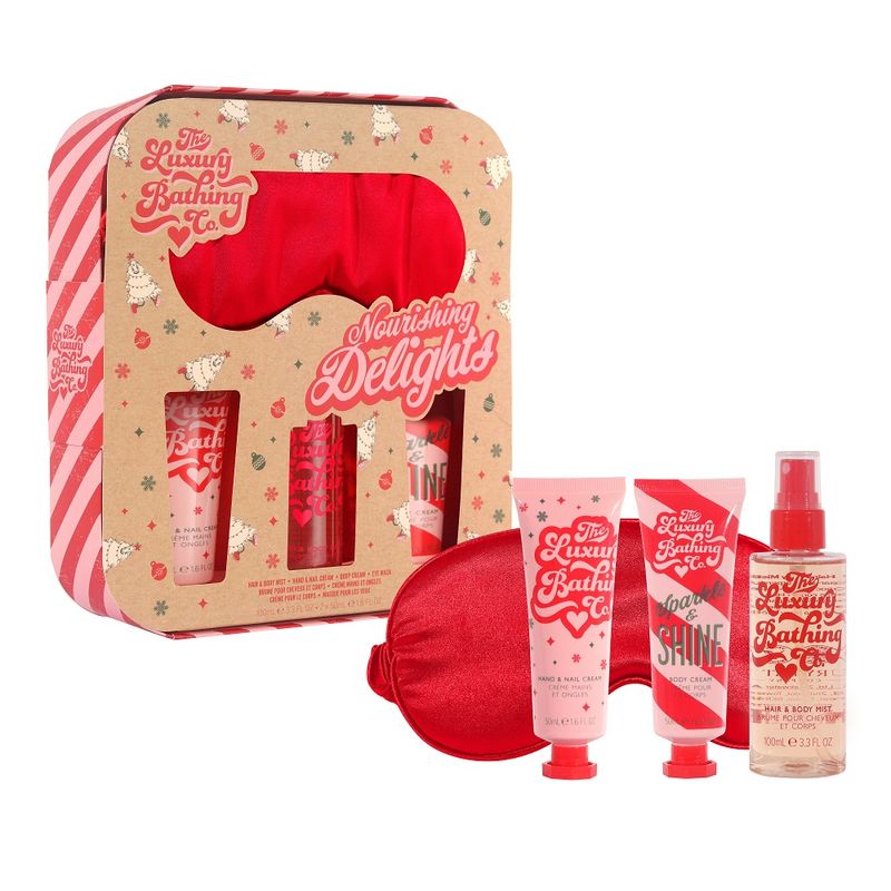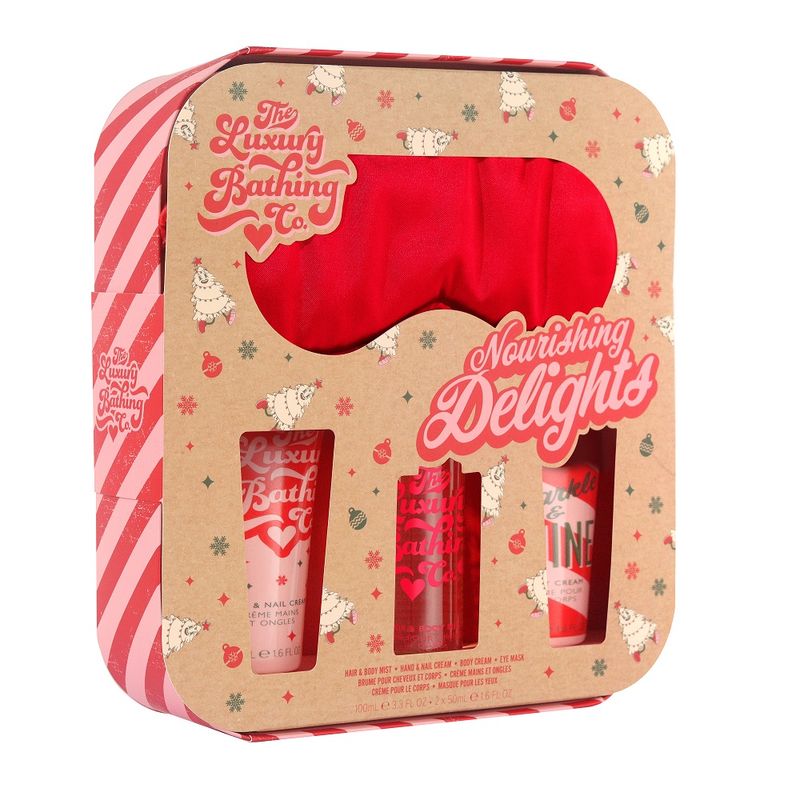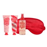 Un set nutritivo con gel de baño, crema de manos, crema corporal y mascarilla reutilizable, perfecto para cuidar y consentir.