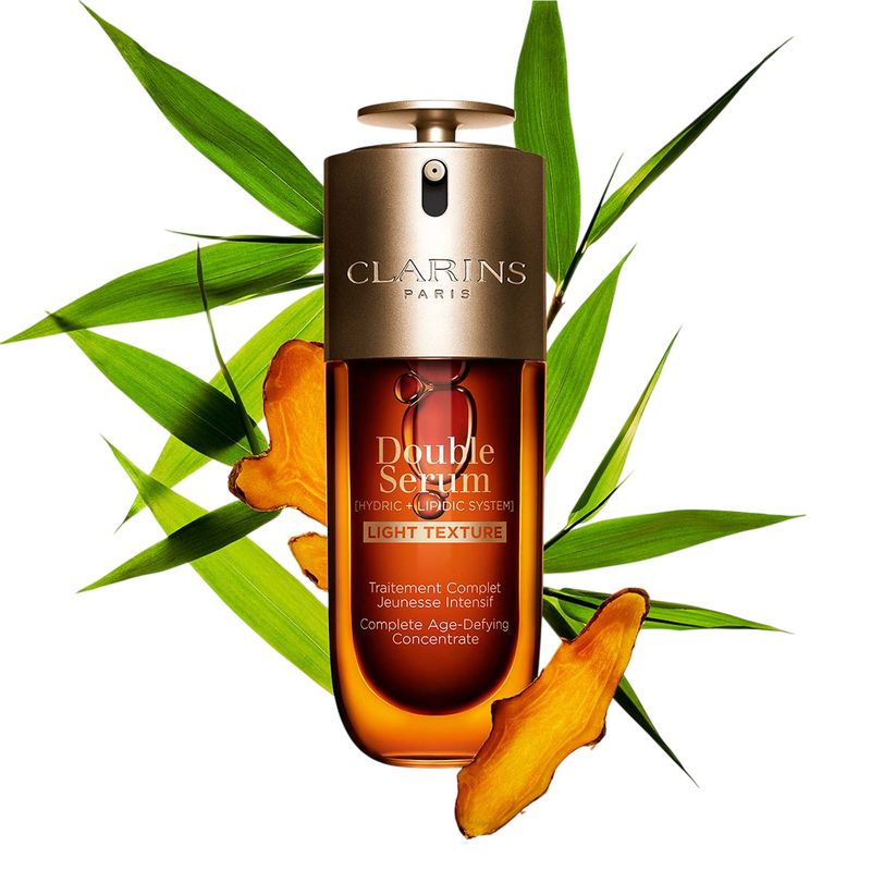 Double Serum Light Texture de Clarins hidrata y combate los signos de la edad con una fórmula ligera, ideal para pieles mixtas a grasas. Textura no grasa, de rápida absorción, con aceites 100% naturales. Perfecto para climas cálidos, pieles jóvenes y hombres.