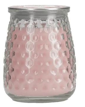 Vela aromática en frasco de vidrio texturizado. Aroma clásico y romántico de rosas frescas con matices verdes. Duración: hasta 100 horas.