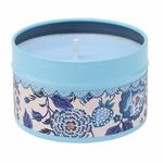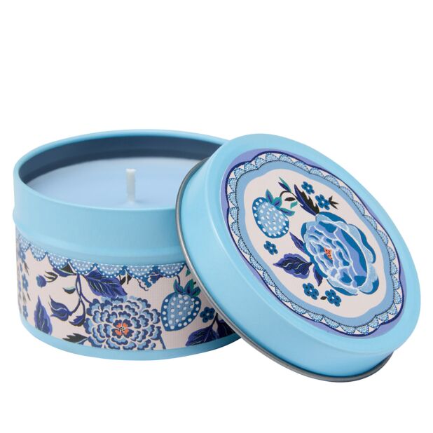 Vela en lata redonda de color azul claro, decorada con ilustraciones pintadas a mano de fresas y flores, tanto en la lata como en la tapa, siguiendo el estilo clásico y alegre de Cath Kidston